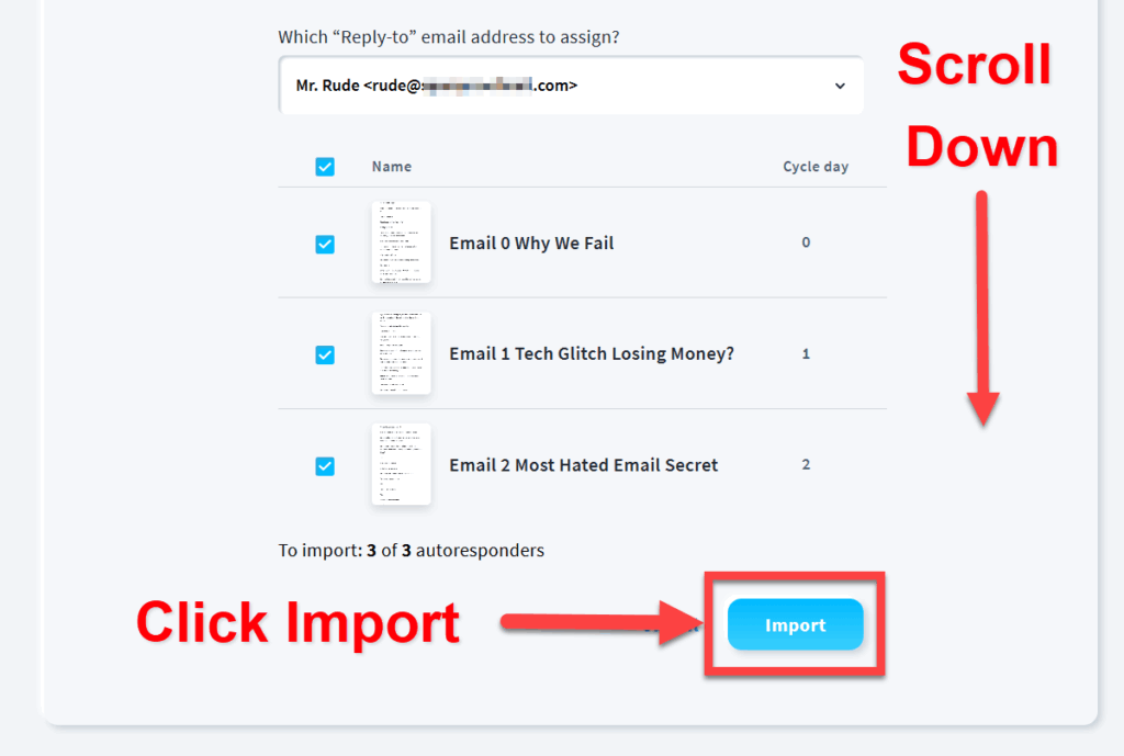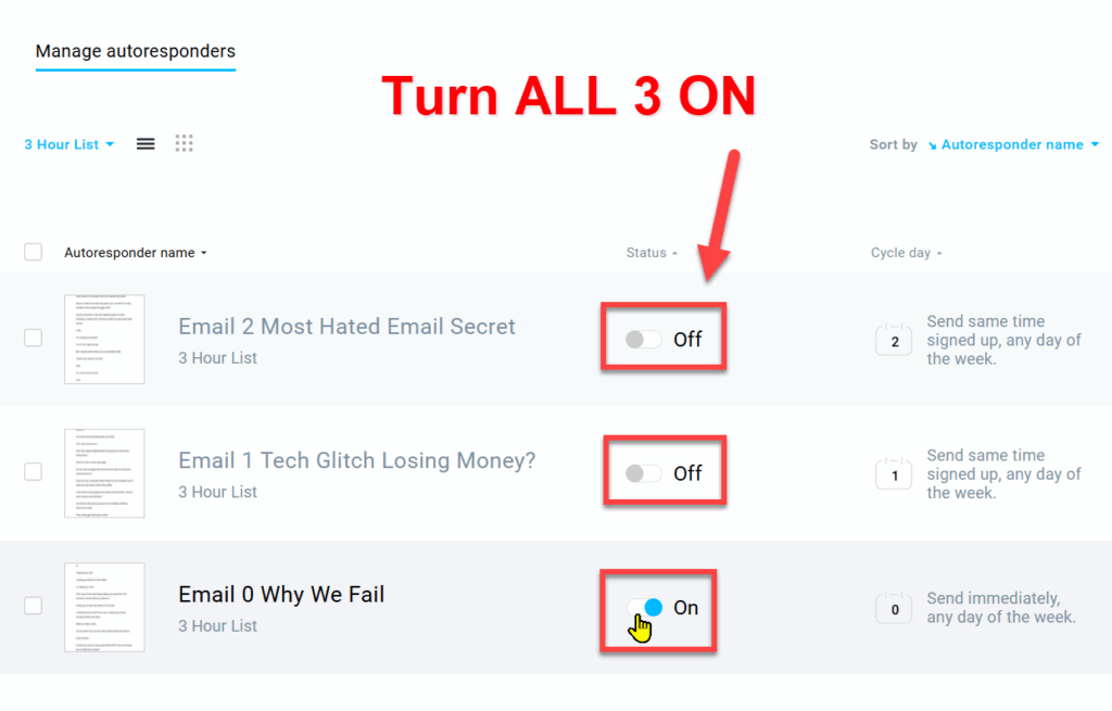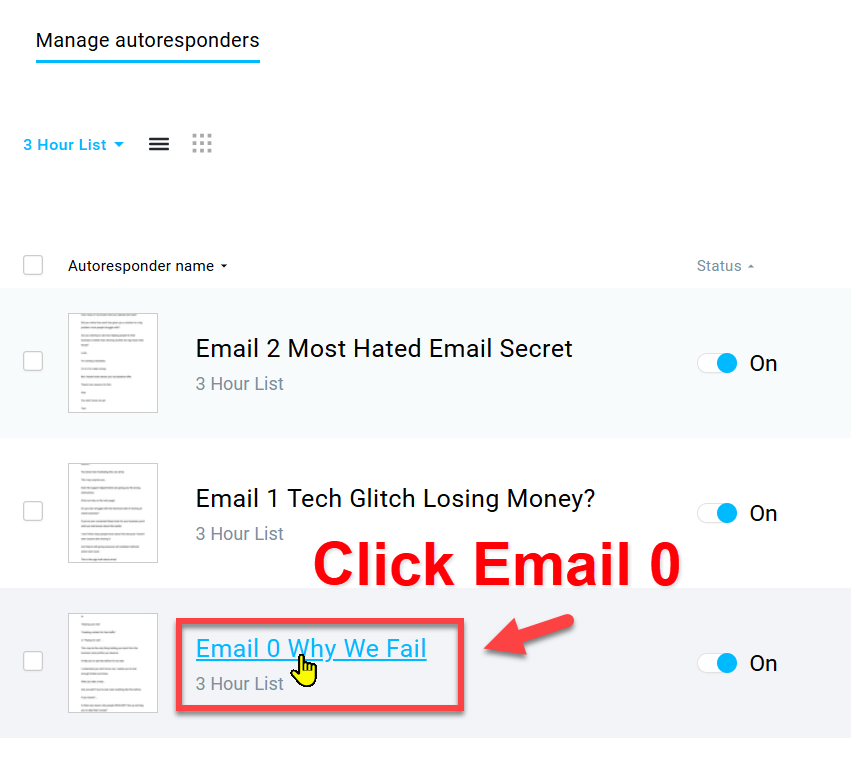 Find the last email or email 0 and click on it. (Make sure all emails say “on” for the status on this page)