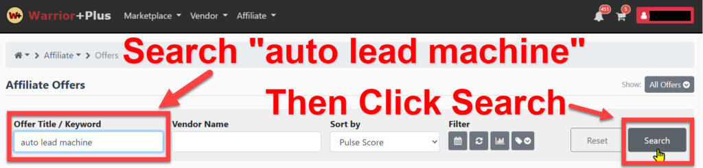 Enter “auto lead machine” under Offer/Title Keyword. Then click the Search button