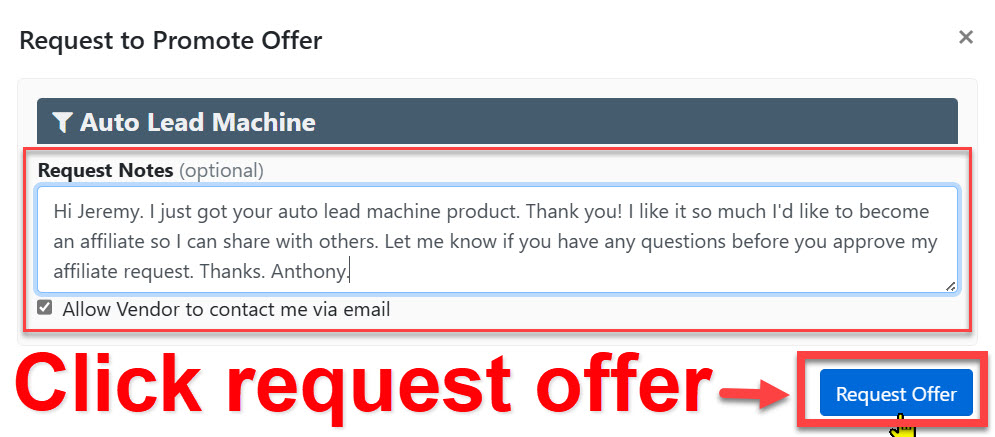 Write a note like mine but make it your own words. Then click on the “Request Offer” blue button.